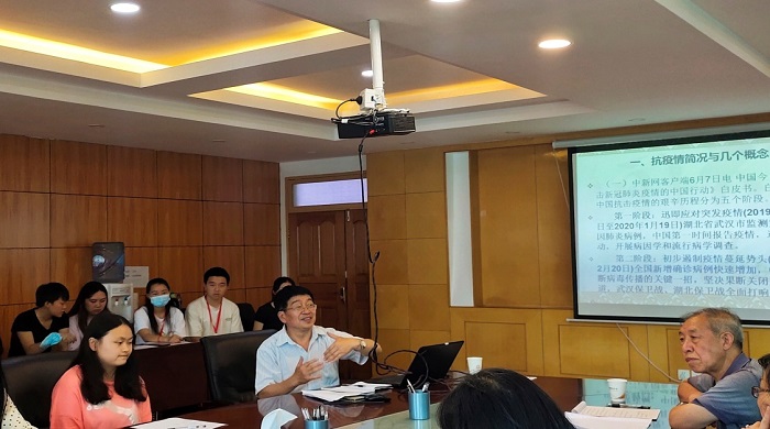 在本次讲座中,游来林教授由自身部队生活引出主题,通过列举此次抗疫过程中的优秀人物、代表事件,对比中西文化、制度以及疫情的应对方式,诠释了共产党员精神,深度剖析了中国特色社会主义道路与制度。王瑛、潘吉、刘雪影及员工党员代表陈秋町参与交流发言。