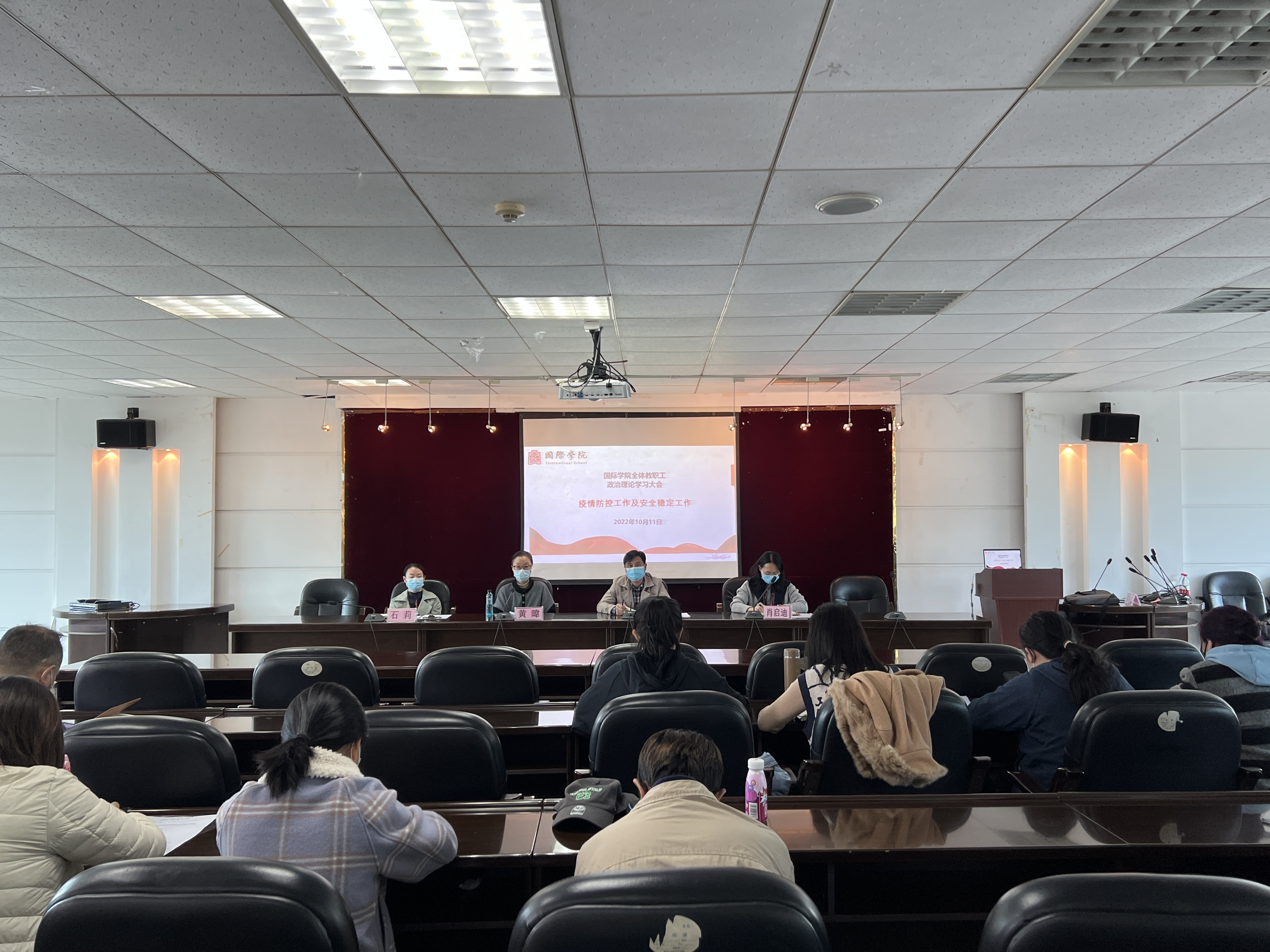 (威廉体育williamhill 杨文静 图文报道)10月11日下午,威廉体育williamhill在鹿冲关校区行政楼六楼会议室召开疫情防控和安全稳定工作会议。会议由公司党委书记王治航主持,党委副书记黄暐、肖启迪,副经理石莉,以及全体教职工参加。
