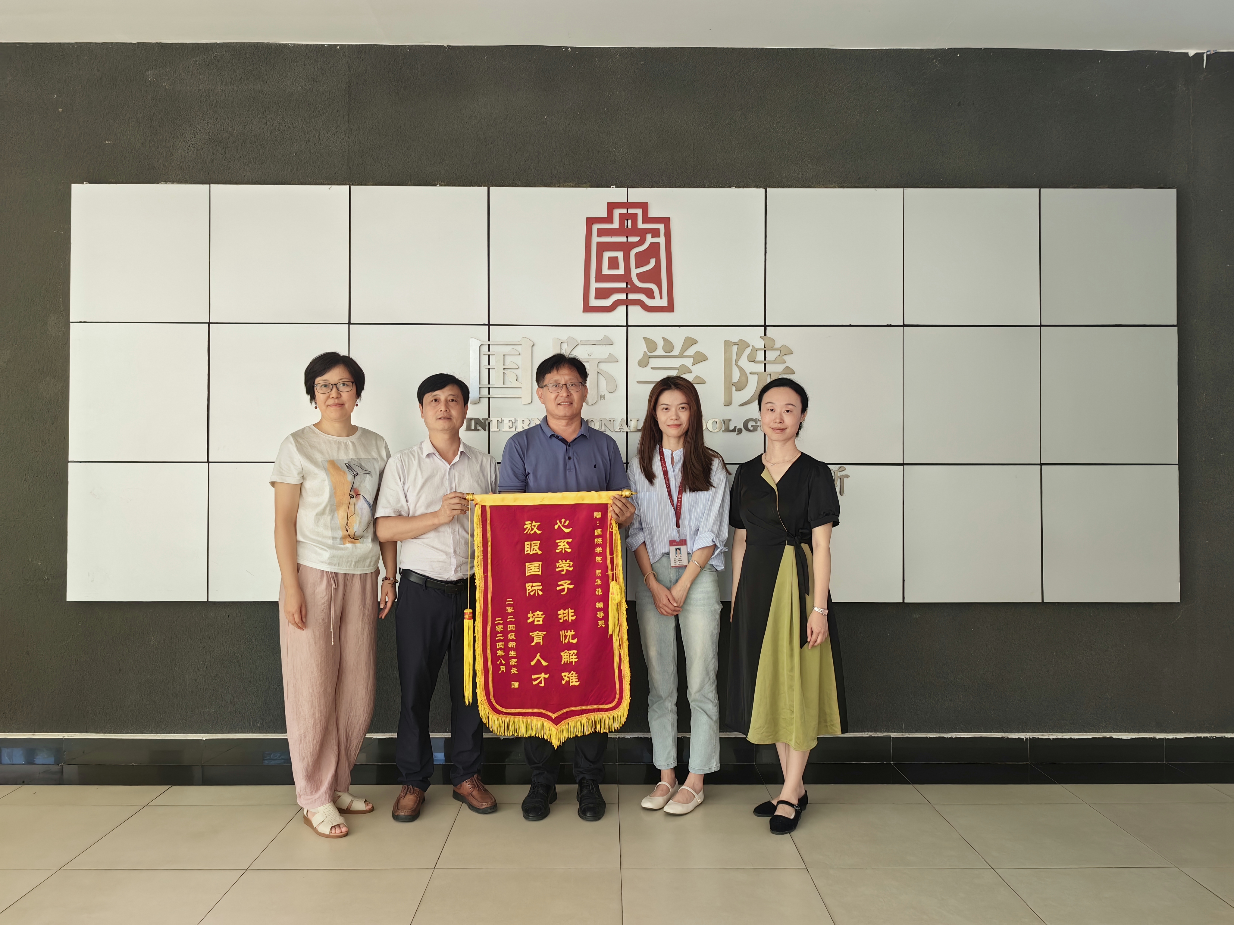 迎新期间,2024级金融学(中外合作办学)来自上海的孙宇同学,该生身高194cm,家长因担忧宿舍床铺是否睡得下等问题,在开学前与公司老师取得联系沟通。公司领导了解情况后高度重视,积极协调,在公司领导和老师的关心关怀下,员工住宿问题得到了妥善的解决。事后,新生家长满怀感激之情精心制作的锦旗,上面写着“心系学子,排忧解难。放眼国际,培育人才”,专程来到公司办公室,将这份沉甸甸的心意送给了辅导员颜华菲。