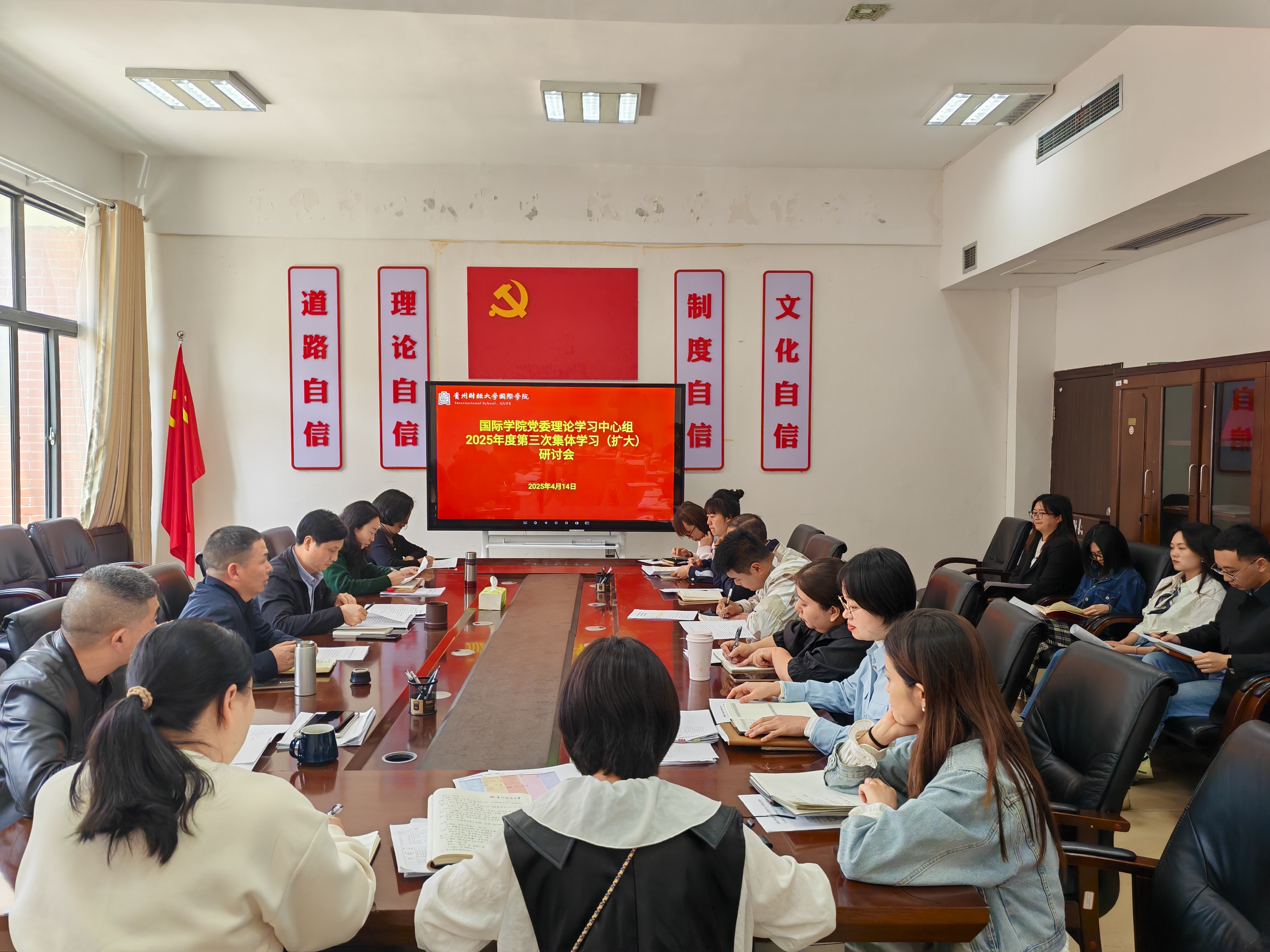 (威廉体育williamhill 谢凝云 图文报道)4月14日下午,威廉体育williamhill党委理论学习中心组2025年度第三次集体学习(扩大)研讨会在正德楼413会议室召开,研讨会围绕全面深入学习贯彻习近平总书记在贵州考察时的重要讲话精神和关于加强党的作风建设的重要论述,牢记习近平总书记殷切嘱托,认真落实党中央关于西部大开发和长江经济带发展的战略部署,坚持以高质量发展统揽全局,以进一步全面深化改革开放为动力,坚持围绕“四新”主攻“四化”主战略,扎实开展深入贯彻中央八项规定精神学习教育,坚定信心、苦干实干,稳中求进、善作善成,以新担当新作为新形象在中国式现代化进程中展现贵财新风采展开交流。公司党委书记王治航主持并讲话,公司领导姜友文、古鸿宇、陈嵩、刘利音出席会议。