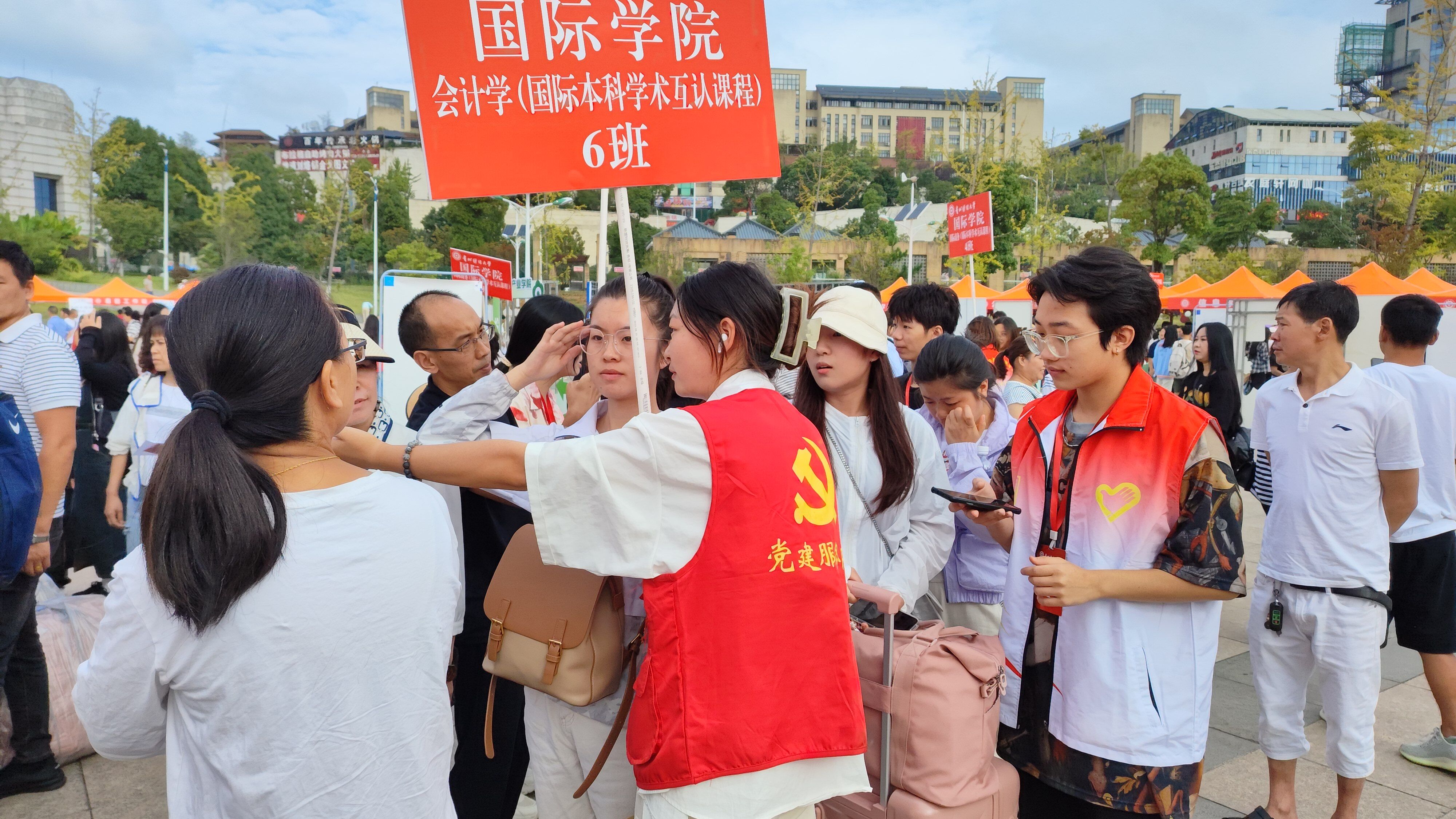 在迎新工作中,志愿者们热情、主动为新生服务,手举指引牌,帮助新生搬运行李,指引新生按照流程安全入校,井然有序地带领新生办理入学手续。党员志愿者们贴心地给新生及家长介绍校园环境,教工党支部印制科室服务员工的职责、办公室地点、联系方式海报,让更多新生和家长快速了解公司。党员志愿者将“党员红”化身“志愿红”,让每一位新生第一时间感受到公司的关怀。