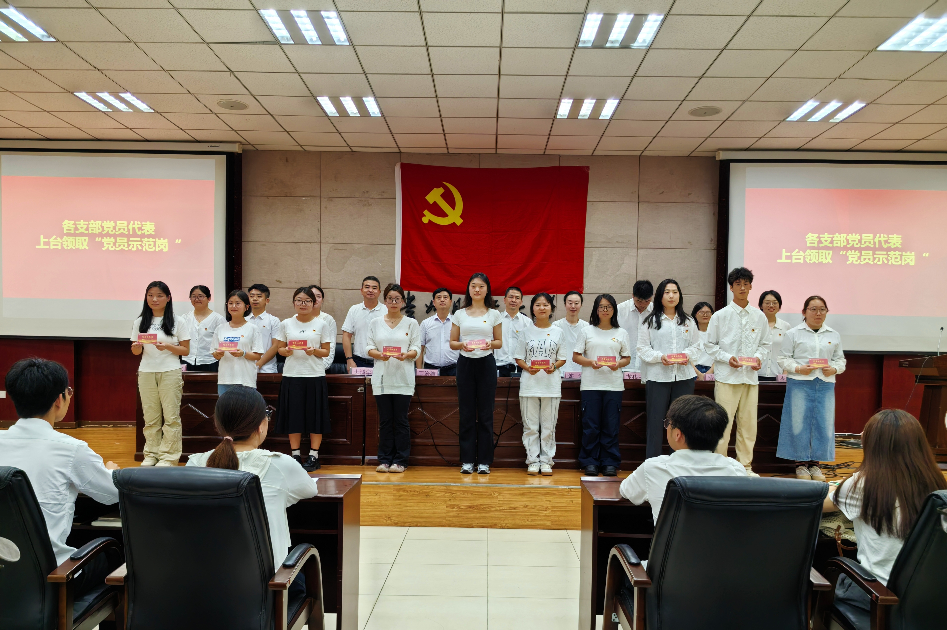 活动最后,各支部党员代表上台领取“党员示范岗”座牌并郑重签字,承诺将以实际行动践行党员使命,为学风建设贡献力量。