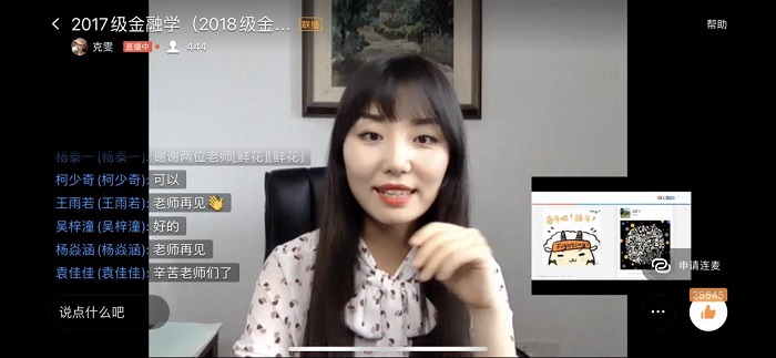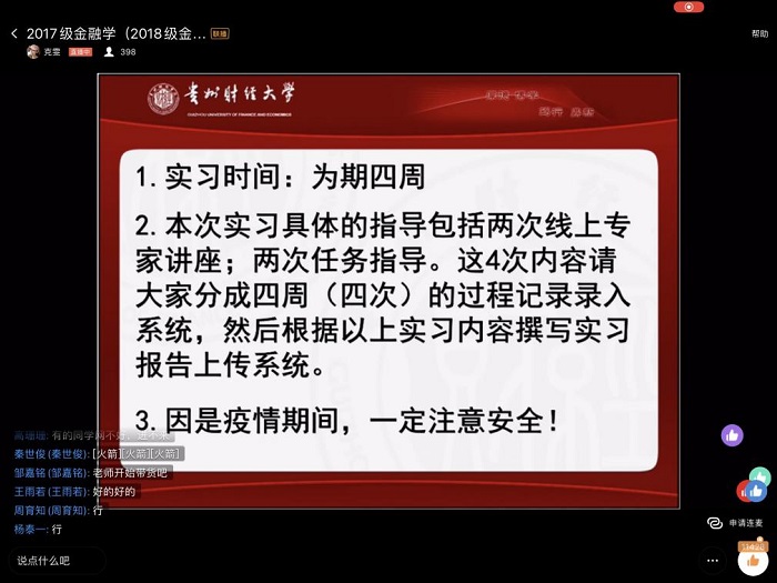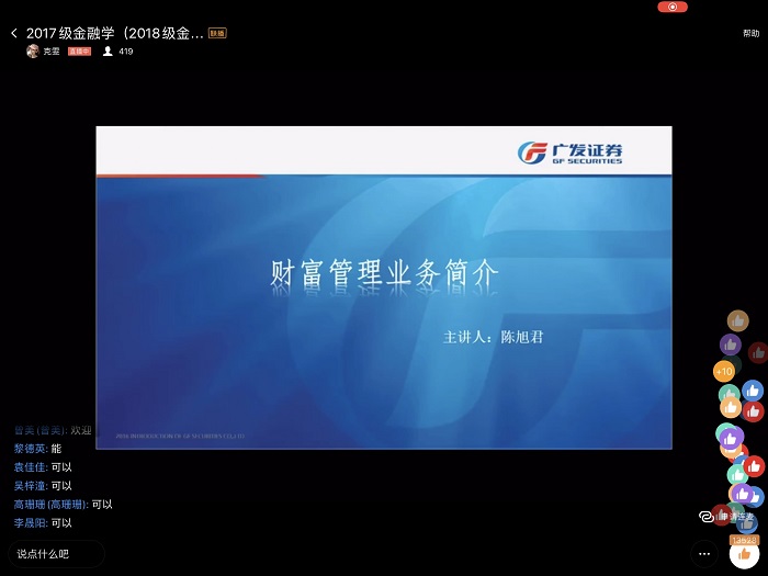 (威廉体育williamhill 刘俊杰 图文报道) 7月14日上午十点,广发证券贵阳营业部财富管理部业务总监陈旭君,通过钉钉群直播的方式,以“财富管理业务”为题,为2017级金融学(中外合作办学)、2018级金融保险专业员工做了一场线上专业实习讲座。讲座由大数据应用与经济公司老师张克雯博士主持, 400余名员工参与了此次精彩的线上讲座。