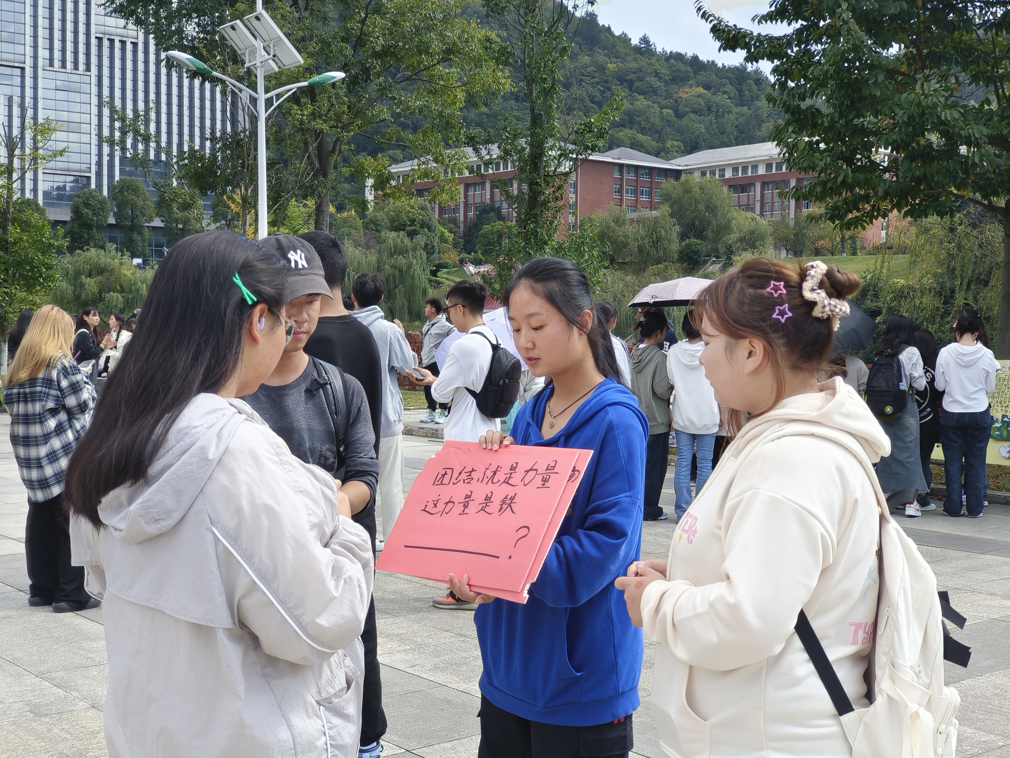 活动现场布置了主题展板,以帮助同学更好地了解以爱国主义为核心的民族精神和以改革创新为核心的时代精神。在“你问我唱”环节,同学们十人为一组。每位同学都以饱满的热情参与其中,你方唱罢我登场。他们用一首首红歌接力传递信仰力量,唱出对党对祖国的热爱之情,在“寓教于乐”中感受时代芳华。在“小诗词大历史”环节,由工作人员朗诵历史诗词,让现场的同学对诗词历史背景进行讲解。同学们充分学习和理解党的相关历史与理论知识,了解党的“初心”与“使命”,更加明确奋斗的目标和方向,激励自己不断奋进。