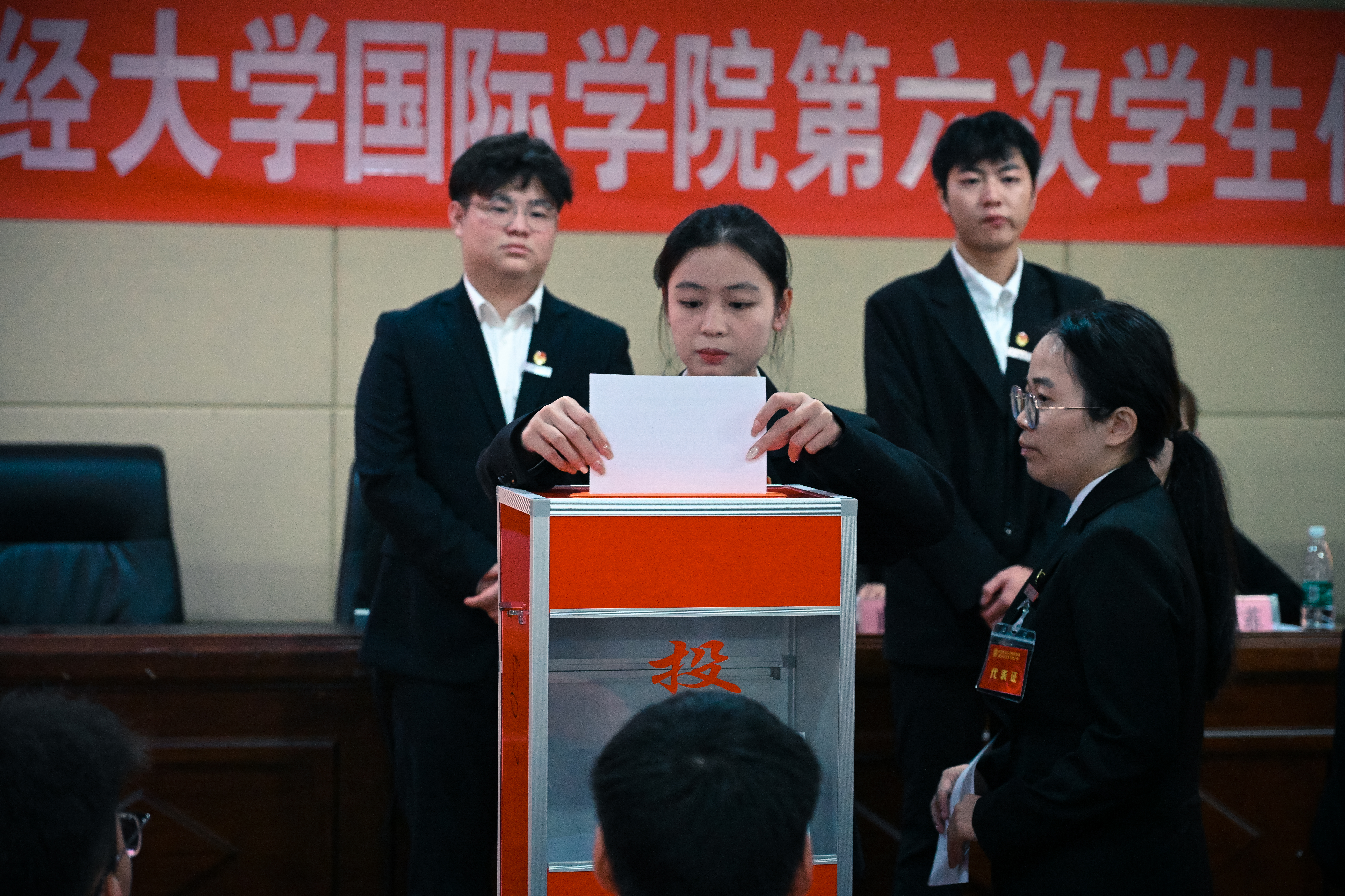 李静同学代表第五届员工会向大会作题为《擘画蓝图开新篇 奋楫笃行启征程——团结带领全院同学在全面建成社会主义现代化强国实践中贡献国际青春力量》的工作报告。大会审议并通过工作报告,选举产生了新一届员工会委员会成员和员工会主席团成员。