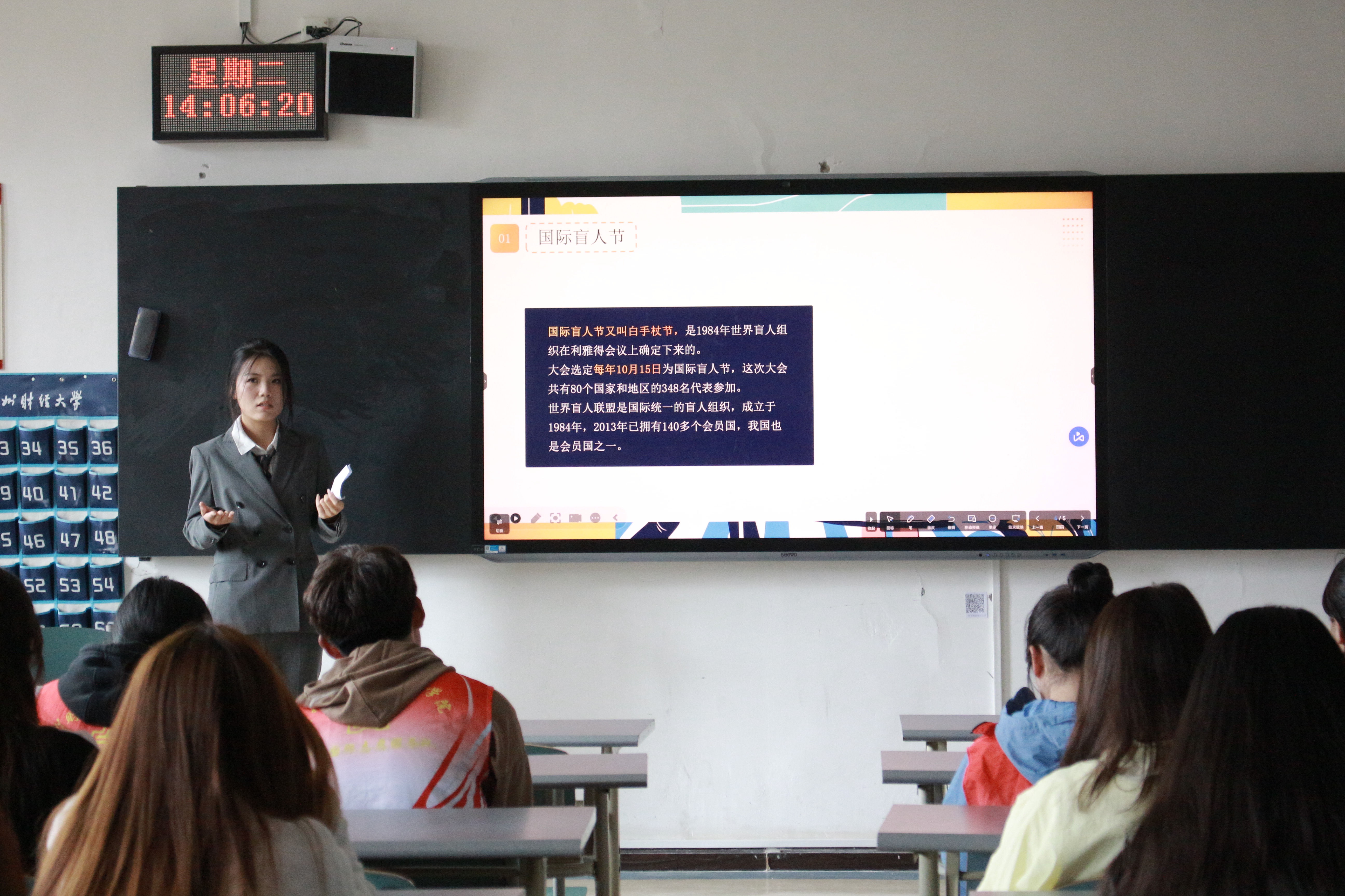 (威廉体育williamhill 王紫欣 报道|摄影 邓逸凡)为增进同学们对盲人生活的了解,弘扬关爱盲人的社会风尚,共同营造一个更加包容和谐的社会环境,10月15日,威廉体育williamhill在博学楼3-22教室举办“关爱盲人生活,倾听盲人世界”之国际盲人节志愿活动。
