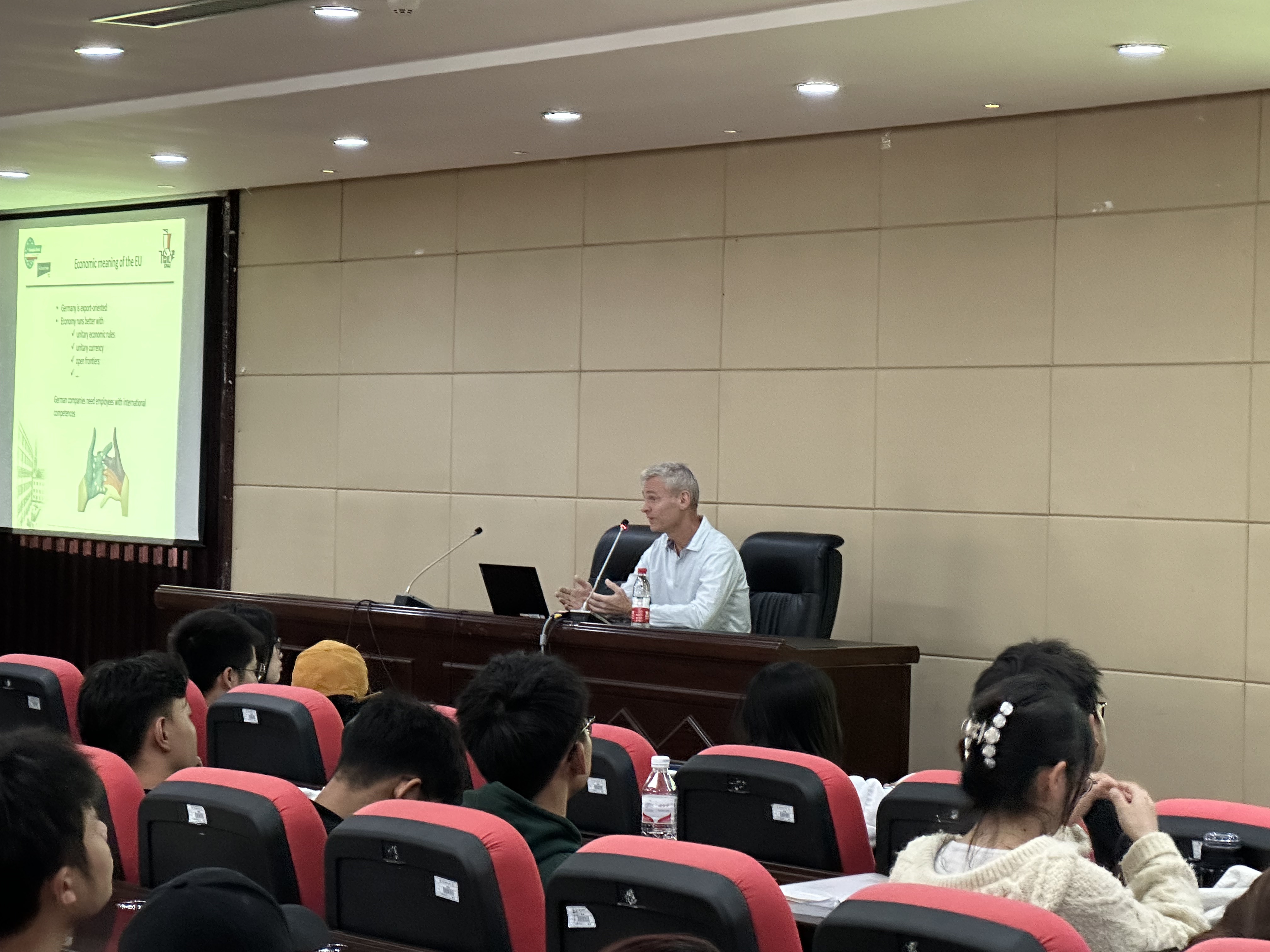 (威廉体育williamhill 邱俊宁 图文报道)为了拓宽员工的国际化视野,增强员工对职业教育国际化的理解,11月3日下午,威廉体育williamhill邀请德国吕贝克汉萨经济职业公司工业、IT、人力资源与活动策划系主任兼对外交流负责人Jens Oberbeck先生为员工作“德国职业教育国际化”讲座。德国汉萨经济管理职业公司董事长Martina Weger一行,德国(贵州)商会会长黎杨,国际交流合作处处长王小华,威廉体育williamhill党委书记王治航、副书记肖启迪、副经理刘利音、项目科工作人员,中德(贵州)教育文化交流中心工作人员及300余名威廉体育williamhill员工参加讲座。