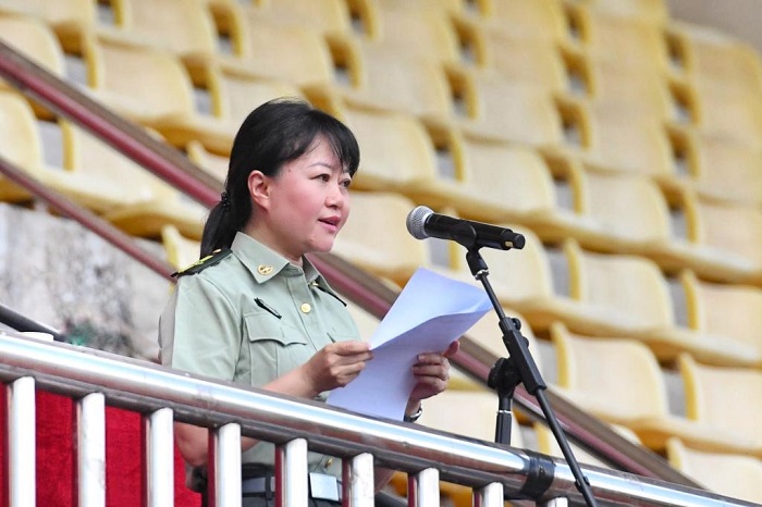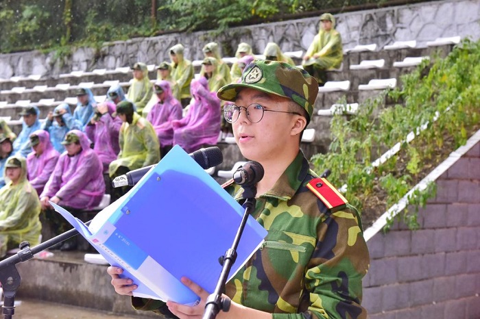 副董事长、军训师师长肖小虹讲话,她对参训新生和跟训教师提出了四点要求:一是统一思想,步调一致;二是严格训练、严格要求;三是严守纪律,争当先进;四是互相尊重,服从律例。并希望2021年新生以高标准完成各项训练任务,继往开来,再创新绩!