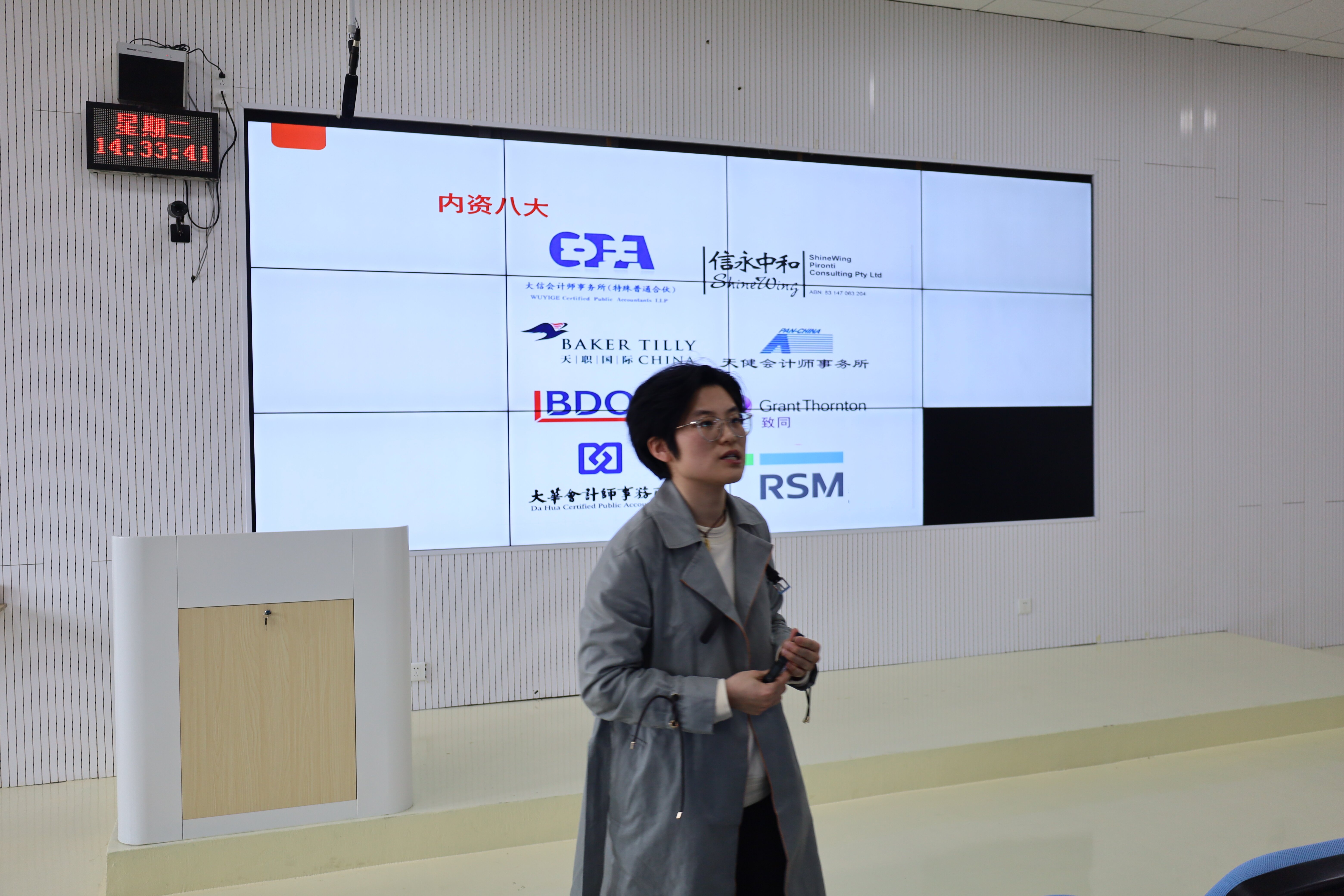 徐婉莹向同学们详细地介绍了国际上公认的四大会计事务所——普华永道(PWC)、德勤(Deloitte)、安永(EY)和毕马威(KPMG),以及瑞华、立信、天健、信永中和、大华、大信、致同、天职国际等内资八大会计事务所,分享了自己的从业经历,并给出了宝贵的职业建议。徐婉莹鼓励同学们要不断提升自己的专业素养和实践能力,积极参与实习和项目实践,为未来的职业生涯打下坚实的基础。