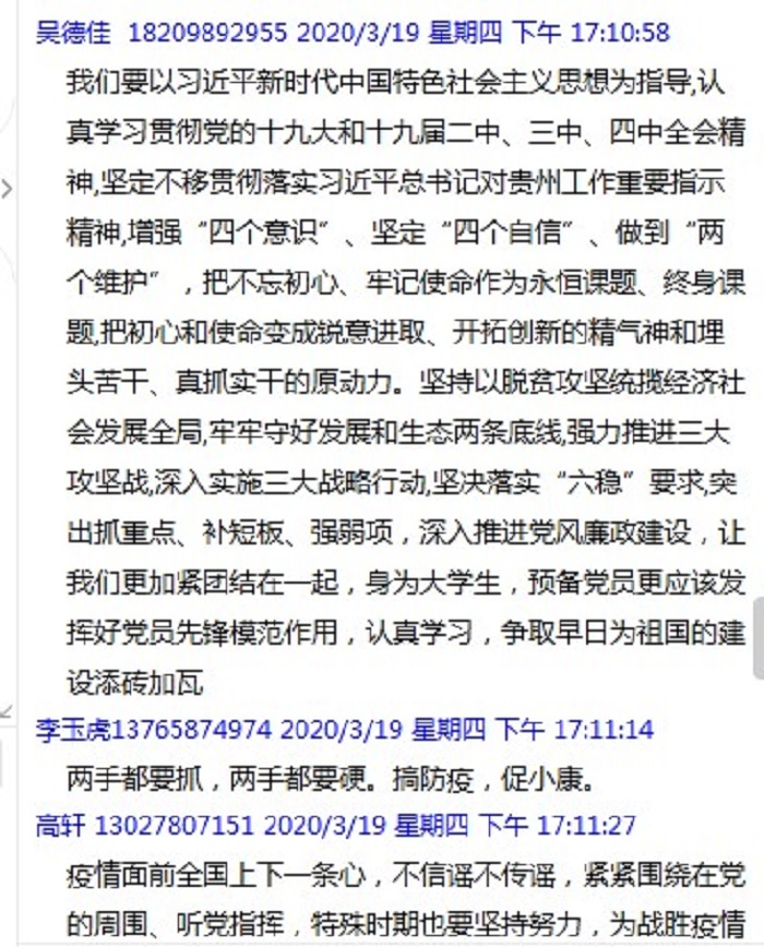 曾海燕、潘田春、李玉虎、孙孟等同志领学《习近平主持召开中共中央政治局常务委员会会议》精神、《2020年贵州省政府工作报告(全文)》《网络信息内容生态治理规定》《中共威廉体育官方网站委员会关于印发<威廉体育官方网站关于新冠肺炎疫情防控延迟开学期间加强师生思想政治教育的实施方案>的通知》《中共威廉体育官方网站委员会组织部关于认真做好在新冠肺炎疫情防控第一线发展党员工作的通知》等文件。领学完毕后,支部党员们积极讨论发言、分享学习心得。大家表示,作为员工党员,一定做好模范带头作用,积极响应国家号召以自身行动感染身边的人。