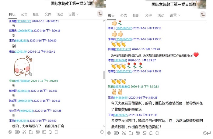王瑛对全体党员认真学习和落实公司对疫情防控工作的各项安排工作表示肯定,同时强调高校作为人员密集的场所,同时也是防控疫情的前沿阵地,时刻按照习总书记的狠抓落实、增强忧患意识、提高工作本领三点要求,履职尽责,认真做好辅导员、党员、员工的思想政治工作,积极配合各职能部门做好疫情防控的各项工作。同时希望党员同志们,能结合自己的实际工作,为这场疫情战疫的最终胜利,作出自己应有的贡献!