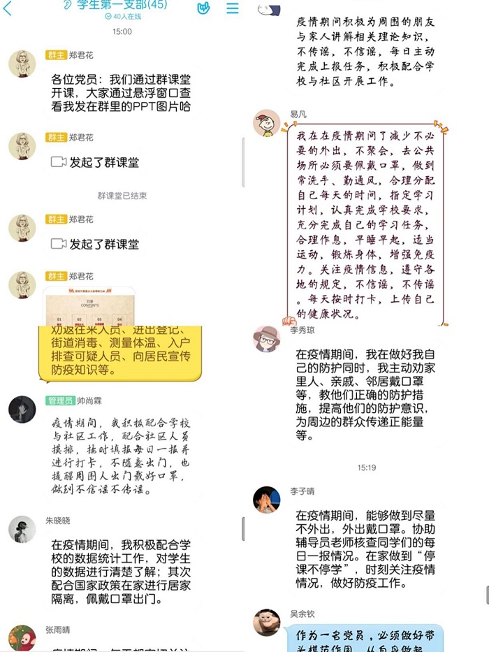 为加强疫情防控延迟开学期间师生思想政治工作,支部书记郑君花通过群课堂的形式为支部党员讲解了新时代爱国主义的硬核力量,让大家更加明确了新时代青年党员肩负的责任与使命。课后,各位同志也积极发言,交流了自己作为青年党员在抗击疫情期间践行爱国主义的实际行动。