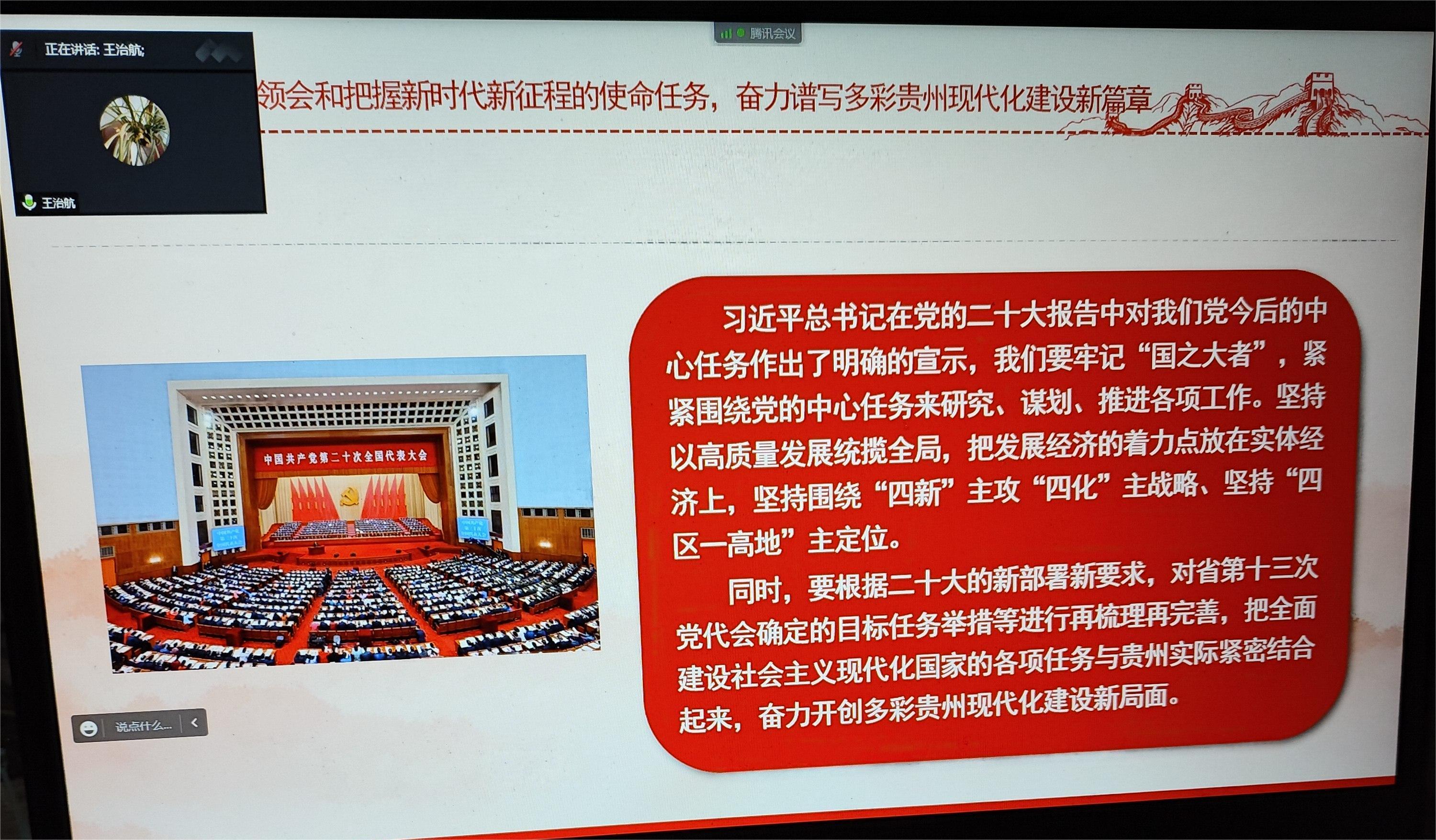 (威廉体育williamhill 潘吉 图文报道)2023年1月13日上午,贵州省教育系统“百千万”人宣讲团成员、威廉体育williamhill党委书记王治航线上为其所在的威廉体育williamhill教工党支部宣讲党的二十大精神。宣讲主题为“深入学习贯彻党的二十大精神 高举中国特色社会主义伟大旗帜,为全面建设社会主义现代化国家而团结奋斗”,威廉体育williamhill教工党支部全体成员参加。