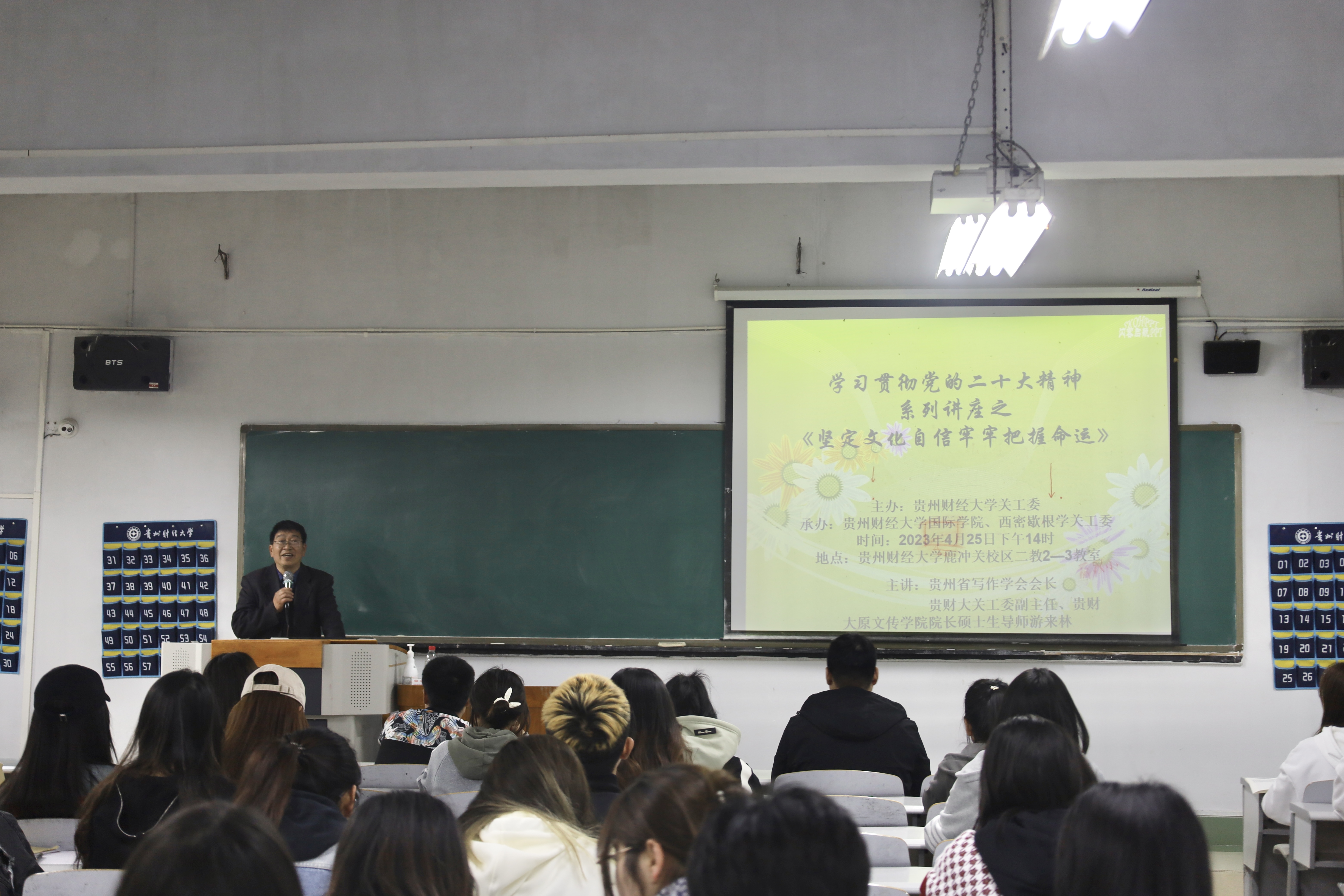 (威廉体育williamhill 孔令巧 报道|摄影 罗佳颖)为深入学习宣传贯彻党的二十大精神,坚定不移推进文化自信自强,4月25日,威廉体育williamhill邀请贵州省写作学会会长、威廉体育官方网站关工委副主任、硕士生导师游来林老师,在鹿冲关校区第二教学楼合2-2教室开展学习贯彻党的二十大精神系列讲座之《坚定文化自信牢牢把握命运》主题讲座。
