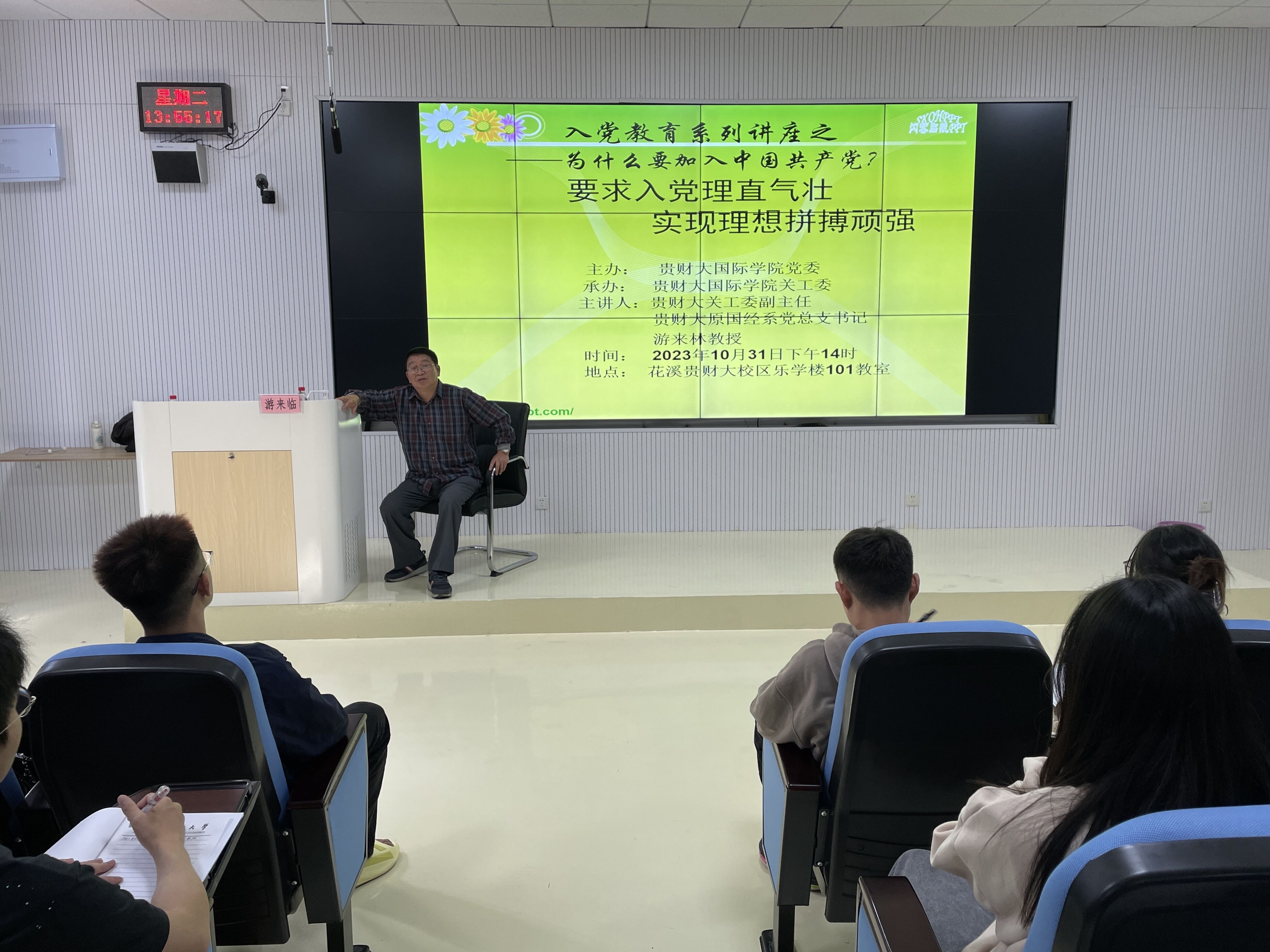 (威廉体育williamhill 周鑫钦 李小菊 报道|摄影 罗湘婷 戴昱辰)10月31日,威廉体育williamhill党校在乐学楼101教室开展“为什么要加入中国共产党”专题党课,威廉体育官方网站关工委副主任游来林教授主讲,公司2023年秋季入党积极分子培训班全体学员参加。
