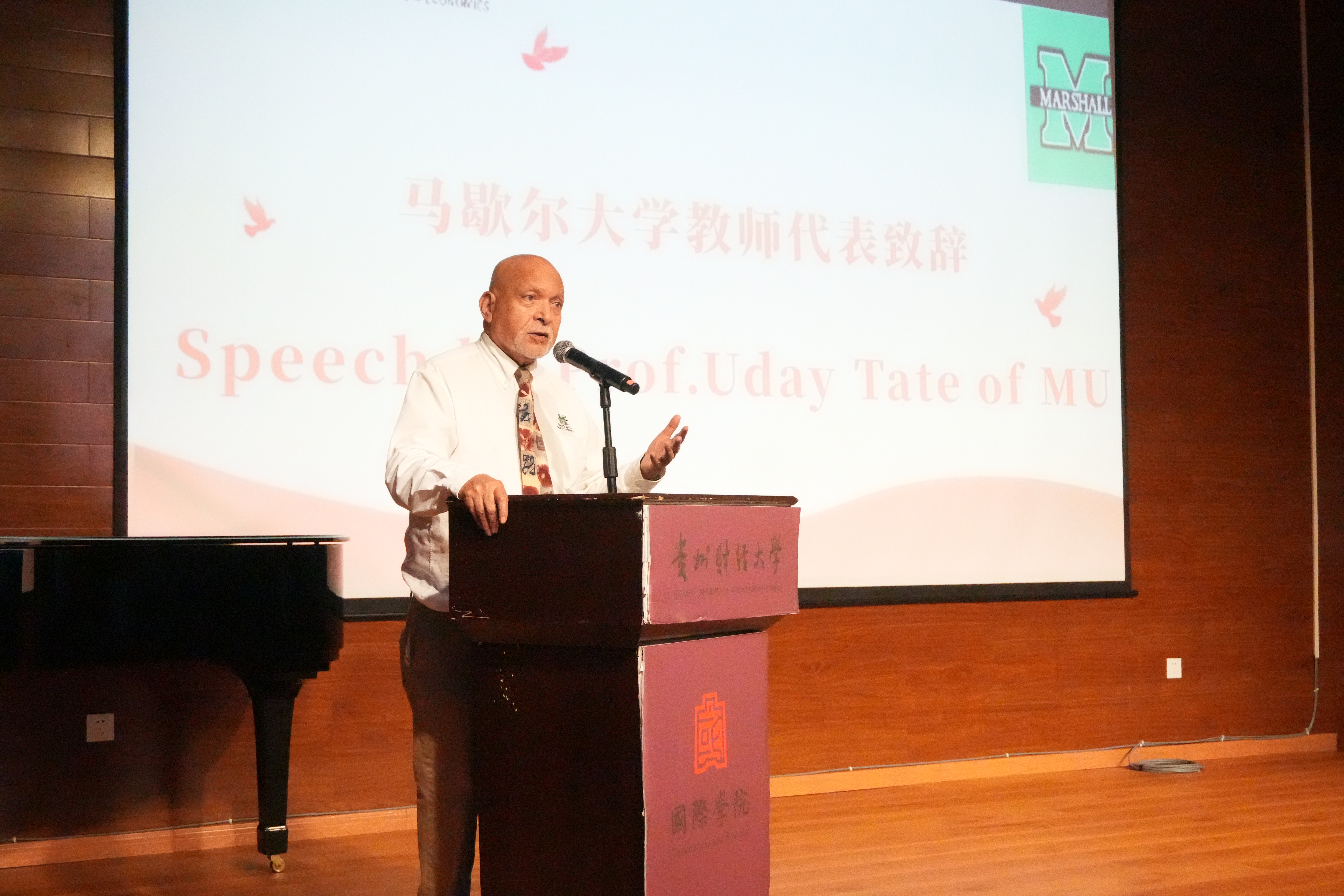 美国马歇尔大学Uday Tate教授致辞,感谢两董事长期以来的紧密合作,并对赛事筹备工作表示高度认可。他表示,本次大赛是双方“合作共赢”理念的生动体现,期待未来通过更多活动深化文化交流与学术互动。