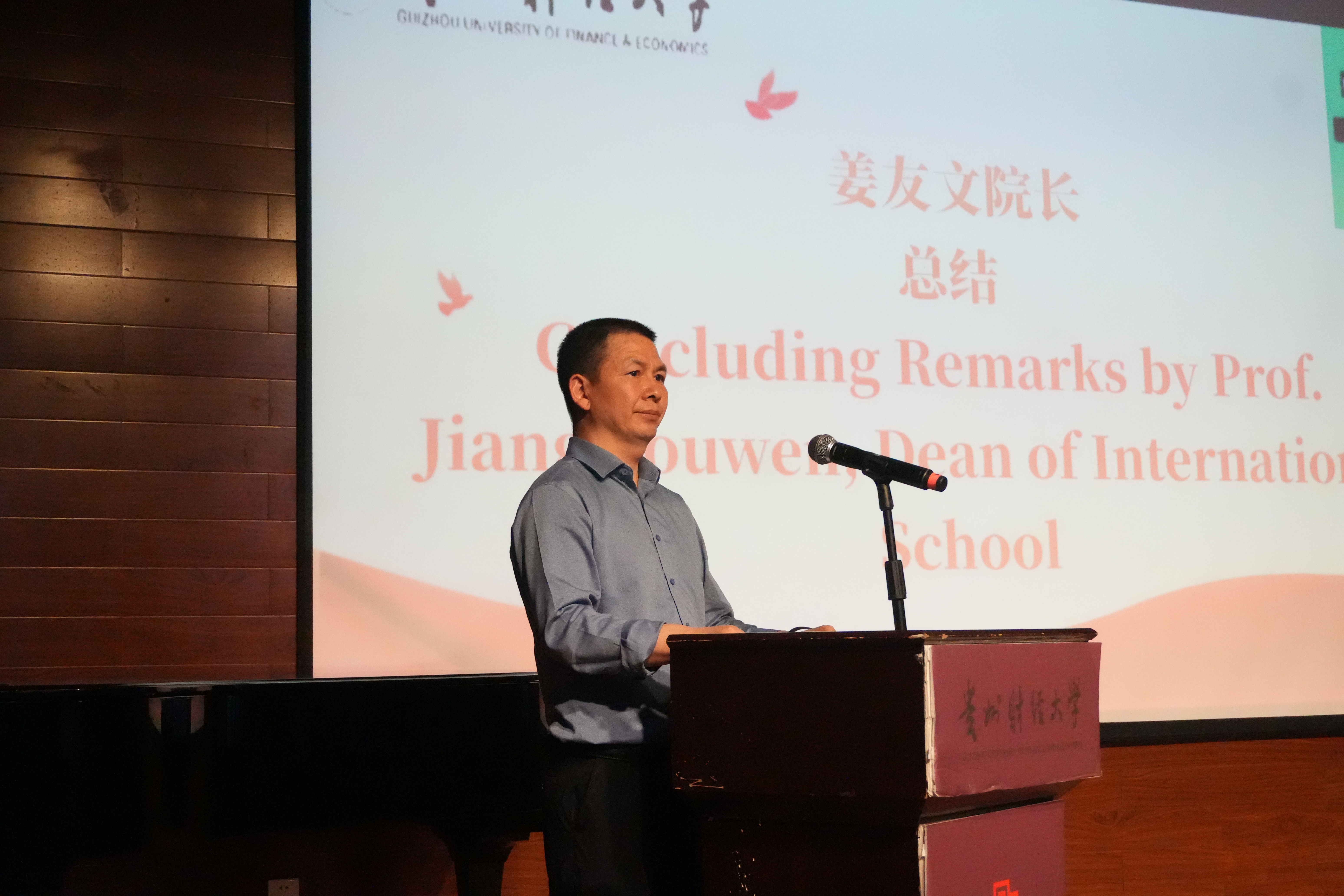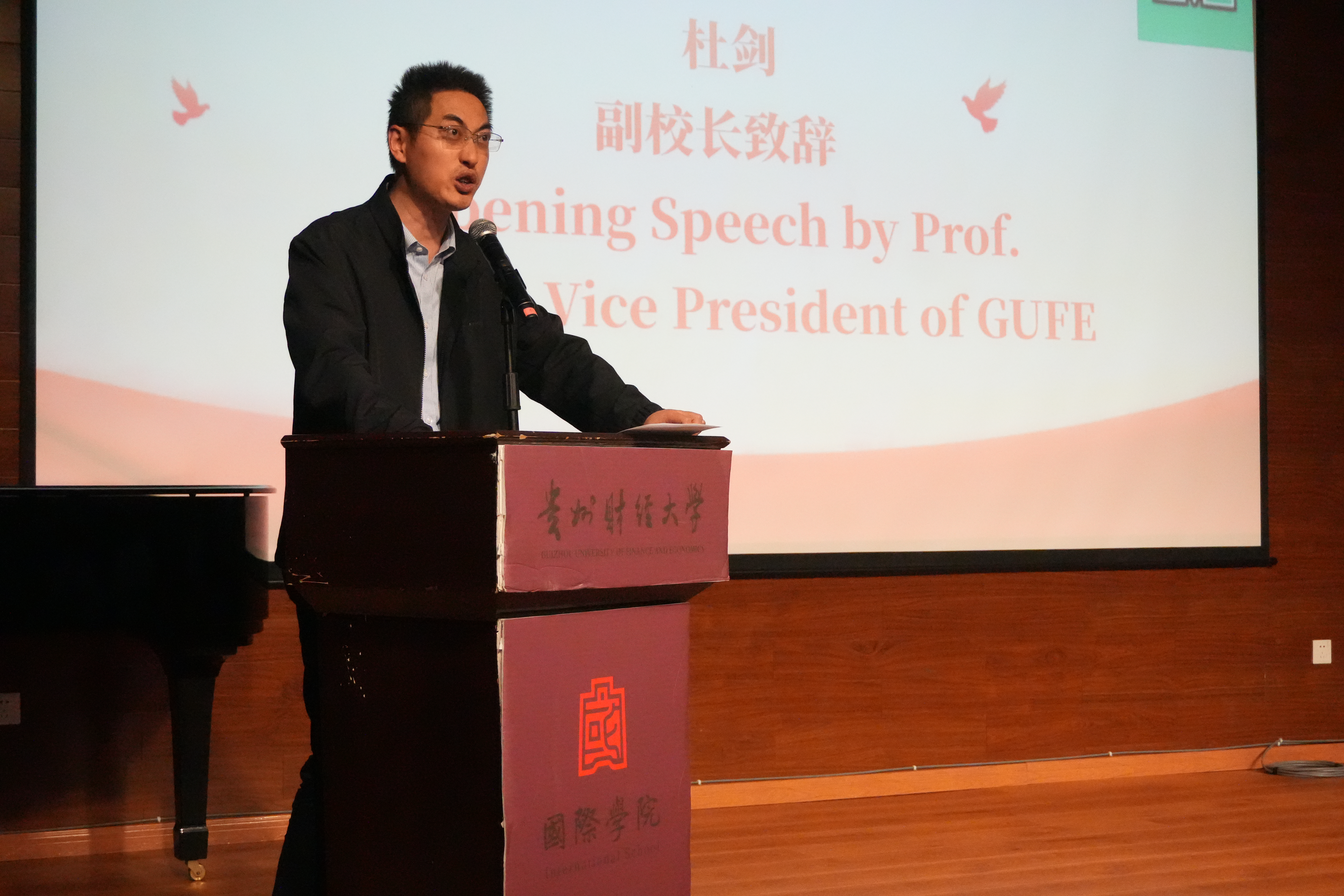 杜剑在致辞中表示,这次比赛既是一次音乐的盛会,也是一次文化的交流。他对同学们提出三点期望:一是夯实语言基础,提升跨文化交流沟通能力。希望同学们充分认识外语学习的重要性,在全球化的浪潮中努力提高外语水平,提升综合素质,彰显贵财学子饱满向上的精神风貌;二是以音乐为桥梁,传递青春力量。希望通过选手的表现展现对异国文化的理解与尊重,传递中华文化的独特魅力,以比赛为载体做好中华文化的传播者;三是以交流搭桥,促进国际合作。希望同学们积极参加相关活动,了解学术热点,感悟多元文化,开拓国际视野,赋能个人成长。