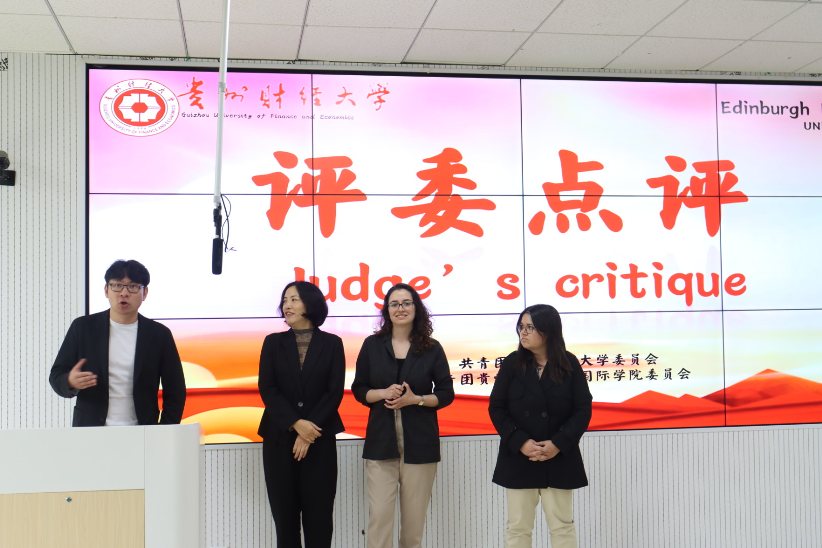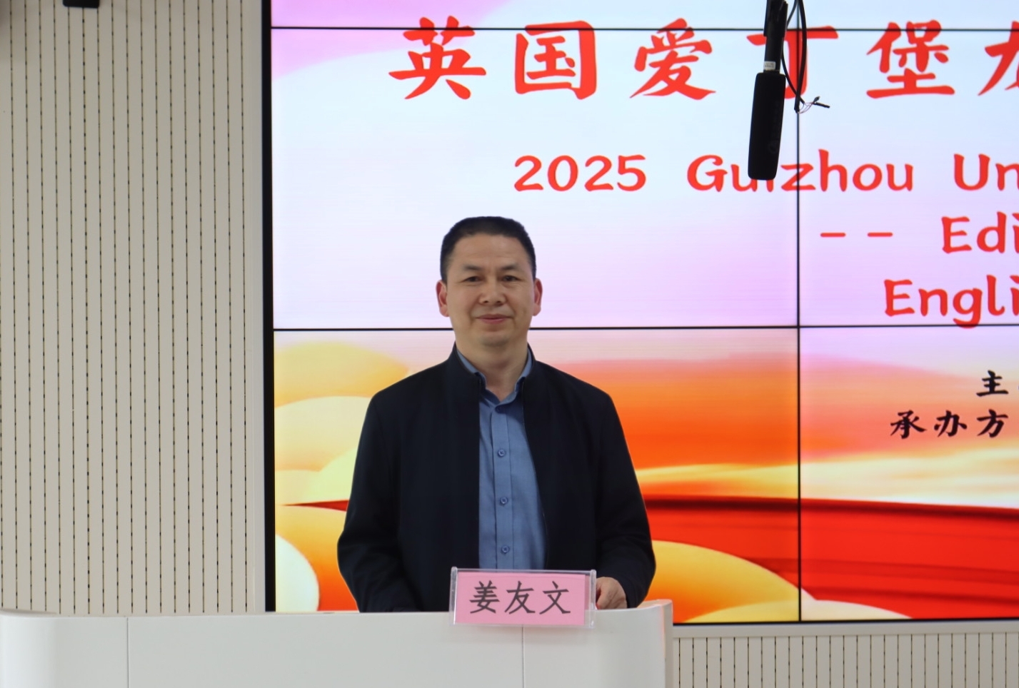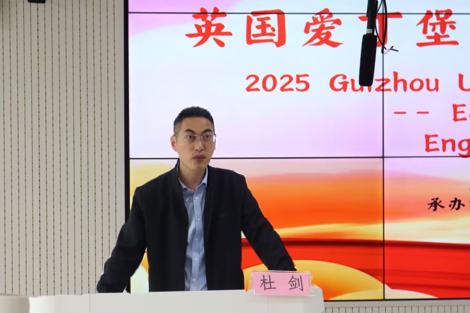 杜剑致辞,他代表公司向远道而来的英国龙比亚大学教师表示热烈的欢迎,向进入决赛的同学们表示衷心的祝贺,同时对同学们提出三点希望:一是夯实英语根基,提升跨文化交流沟通能力。希望同学们充分认识外语学习的重要性,掌握好外语这一跨文化沟通和交流的重要媒介,在全球化的浪潮中努力提高外语水平,加强表达能力,提升综合素质,彰显贵财学子饱满向上的精神风貌;二是以文化铸魂,坚定四个自信。希望同学们讲好新时代中国的伟大成就和巨大变革,传播好中国道路和中国方案,阐释好中国理论和中国实践,讲好中国故事,向合作院校师生展示可信、可敬、可爱的中国形象;三是以交流搭桥,促进国际交流合作。希望同学们积极参加国际学术与文化活动月相关活动,了解学术热点,感悟多元文化,开拓国际视野,赋能个人成长。