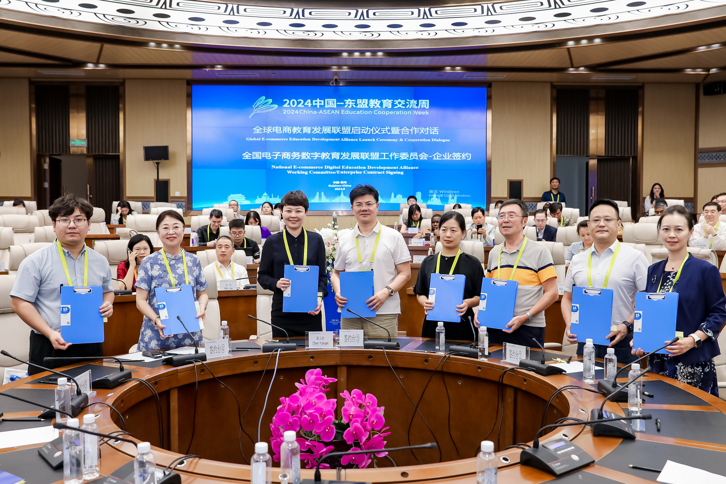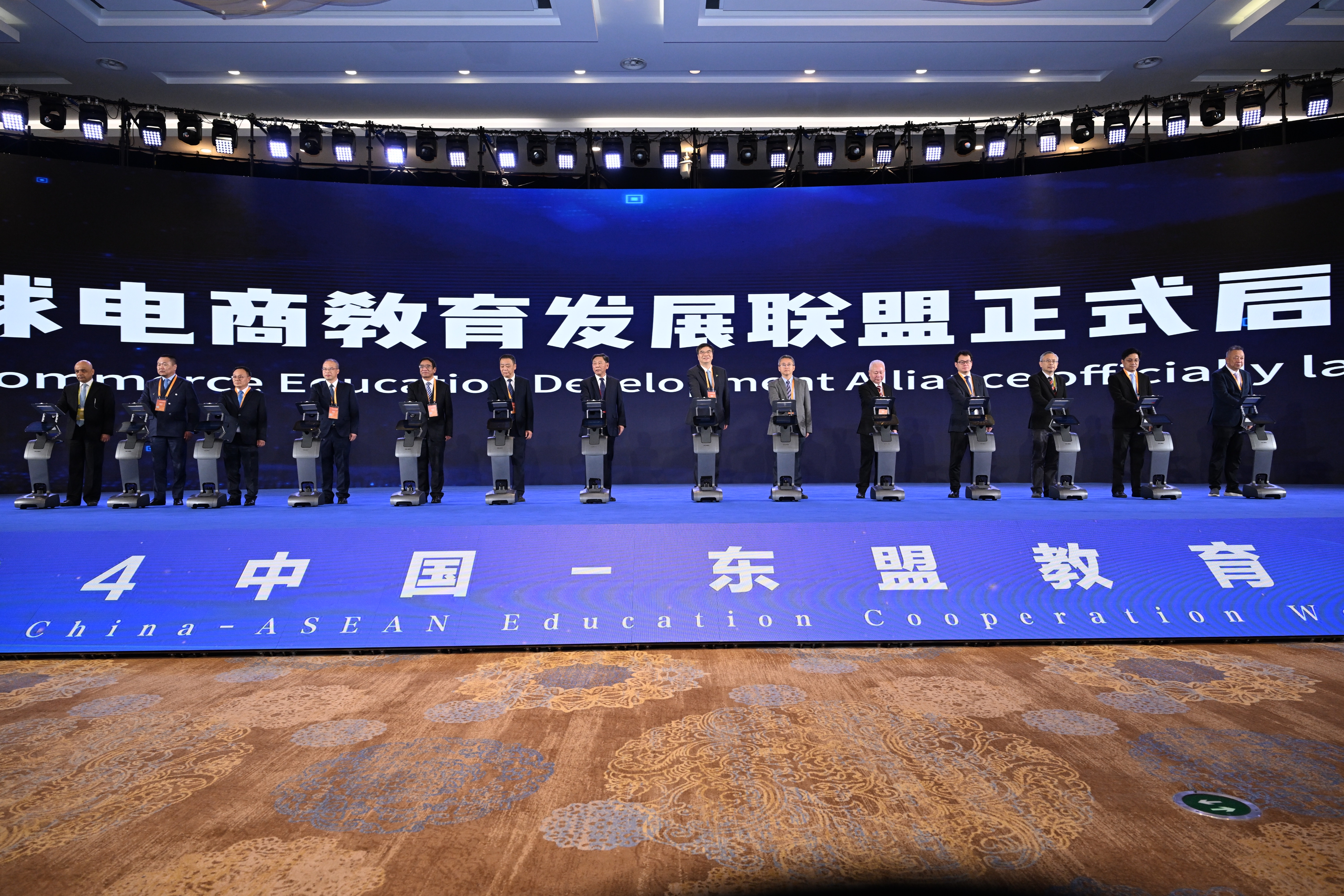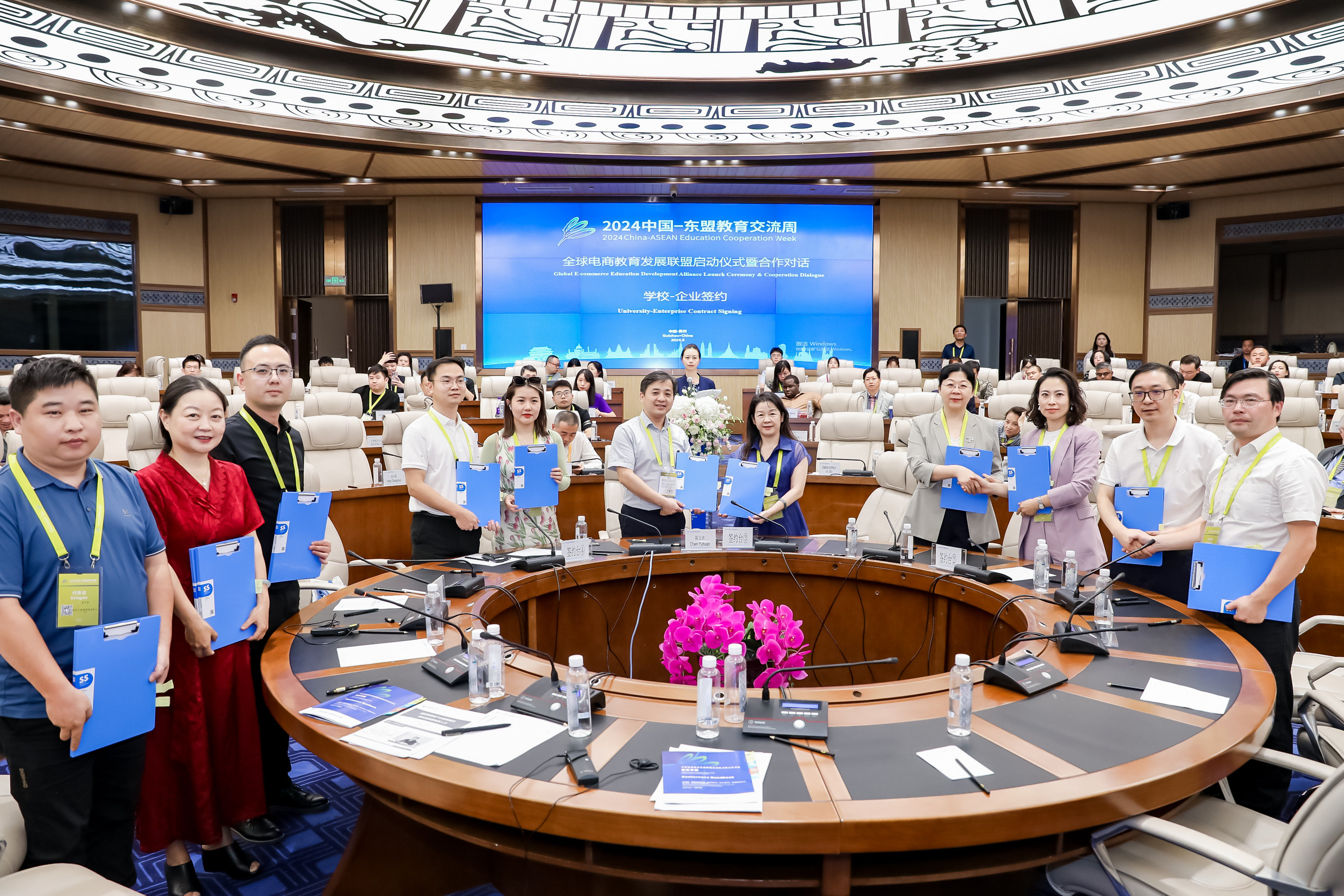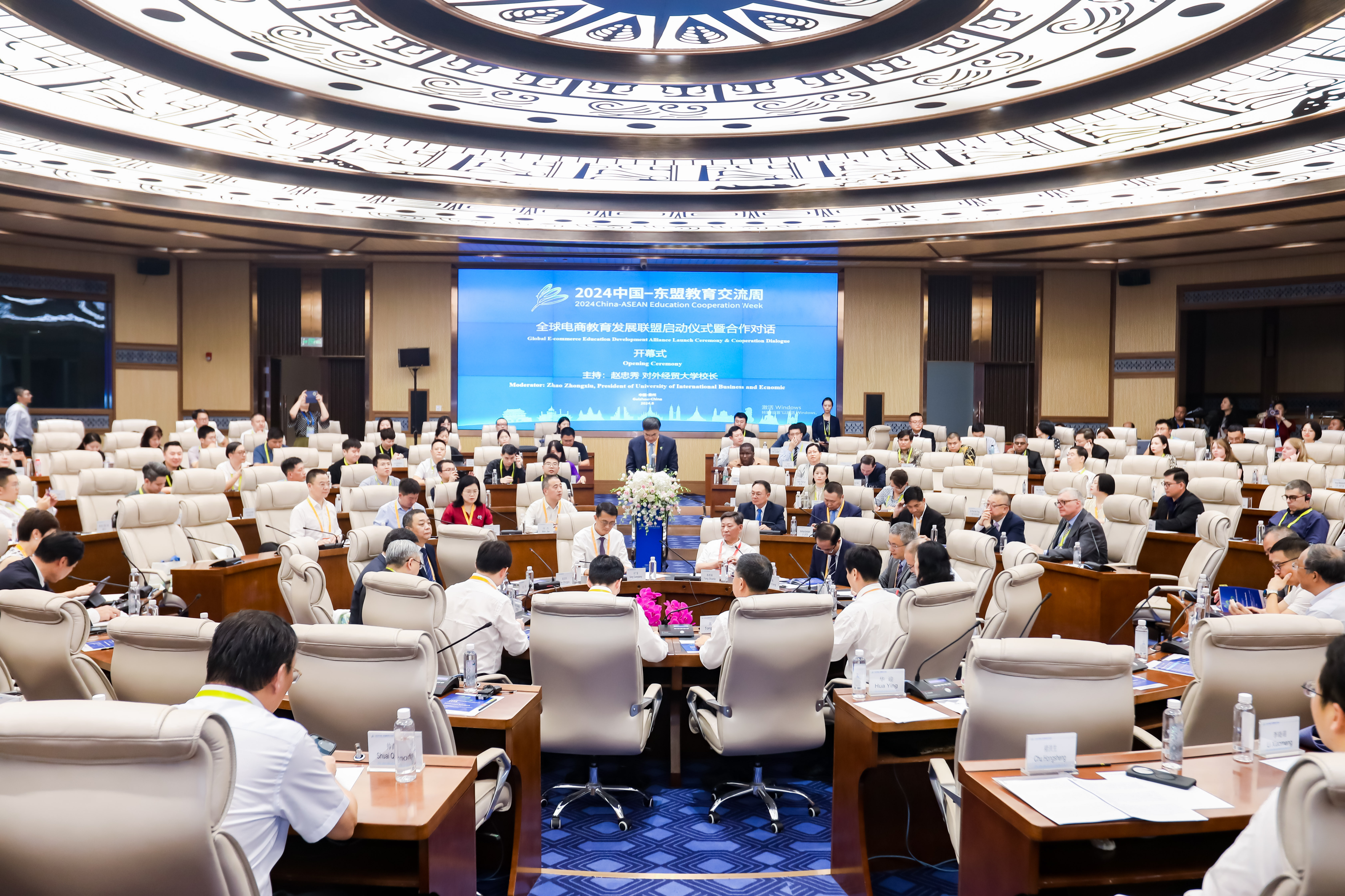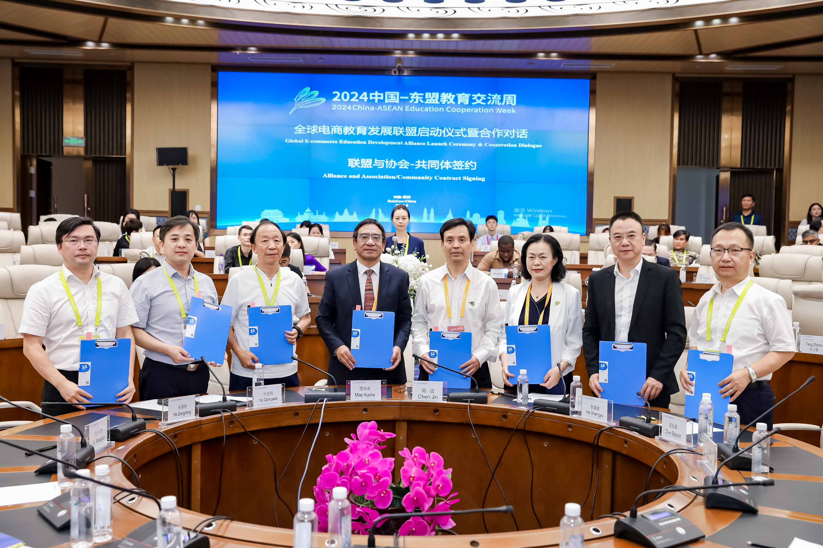 (威廉体育williamhill 刘利音 王伟苗 报道|摄影 邱俊宁)2024中国-东盟教育交流周全球电商教育发展联盟启动仪式暨合作对话在8月21日举行。本次活动由对外经济贸易大学、威廉体育官方网站、浙江工商大学、马来西亚拉曼大学共同主办。全球电商教育发展联盟启动仪式在交流周开幕式上进行。中国工程院院士杨善林、对外经济贸易大学董事长赵忠秀、中南财经政法大学董事长杨灿明、西南财经大学董事长李永强、浙江工商大学董事长王永贵、威廉体育官方网站董事长缪坤和等与老挝乌多姆赛省教育体育厅SOMSACK SOUPHILAY厅长、蒙古财经大学Munkhbayar. Byambadash董事长、马来西亚拉曼大学董事长尤芳达、柬华应用科技大学执行董事长钟耀华、印度工商会联合会执行董事Atul Dalakoti先生、泰国正大管理公司助理董事长、中国东盟研究中心主任Tang Zhimin先生等中外嘉宾十四名一起上台参加了启动仪式。联盟的正式成立标志着在推动全球电商教育合作方面迈出了坚实的一步,对于提升全球电商教育的整体水平,促进“一带一路”共建国家数字经济的发展,具有深远的意义。